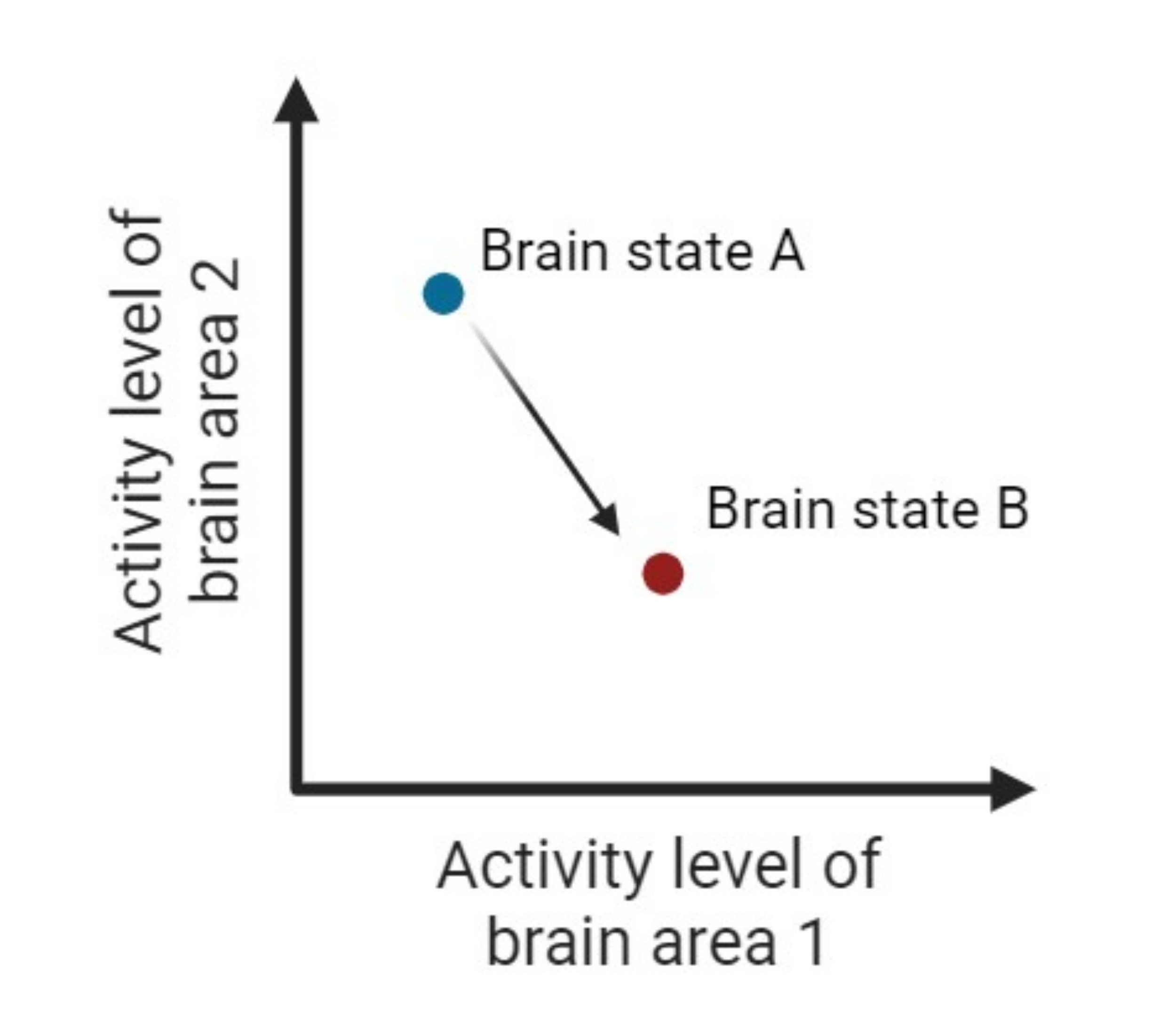 Figure 1: Simplified representation of brain states. In this example, the brain has only two areas and the brain state is defined by the activity of region 1 and region 2.