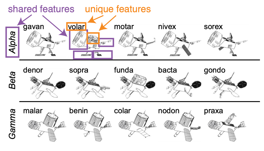 Figure 1. Satellites used in the memory task. Satellites belonged to three groups: alpha, beta, or gamma. The purple and orange boxes highlight the shared and unique features of the satellite volar. The purple boxes show volar’s features that are shared with other satellites in the alpha category, while the orange boxes show the features that are unique to volar.