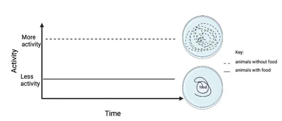 To explore this question of how genes might influence social feeding, Mara studied the behavior of an animal called C. elegans, which is a worm-like animal about the size of a grain of sand. Despite their small size and relatively simple nervous system, these worms can perform many different social behaviors, including social feeding. Social worms tend to clump up together, or aggregate, while eating. In addition to exhibiting the behavior that Mara is interested in, C. elegans are commonly used in labs because experimenters have very precise control over the genes that the worms express. Worms that express a particular set of genes are referred to as a strain. This makes C. elegans the perfect animal to study how genes influence social feeding behavior.