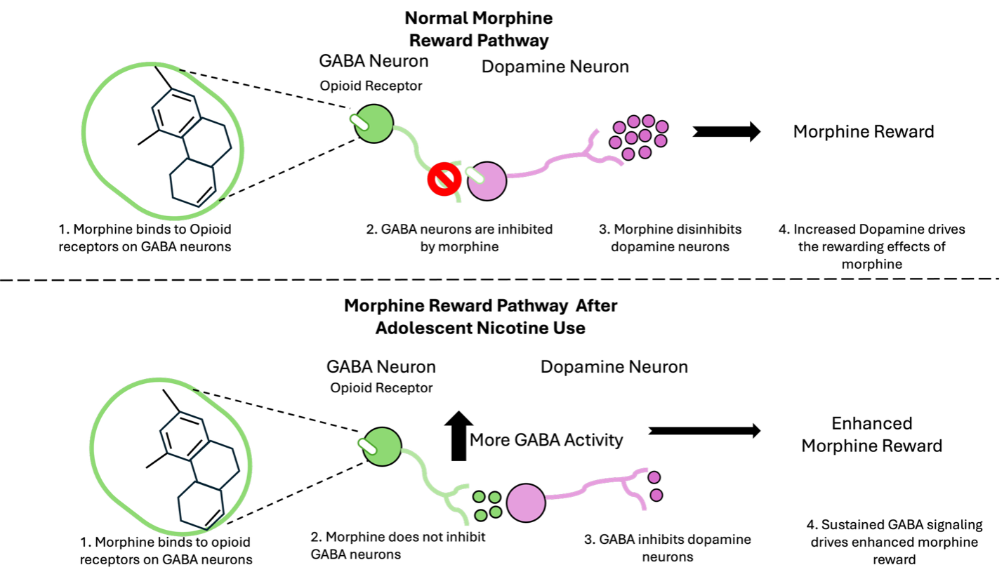 Chronically using nicotine in adolescence changes how VTA GABA neurons communicate with other neurons. Ruthie wanted to know how adolescent nicotine use changes how VTA GABA neurons respond to morphine in adulthood. As a result, she used patch-clamp electrophysiology to record the electrical activity of these neurons. An important thing to note is that opioids like morphine bind to endogenous opioid receptors, meaning receptors mice already have on their VTA GABA neurons. When morphine acts on these receptors, it inhibits neural activity. Moreover, GABA neurons quiet the VTA dopamine neurons and morphine quiets GABA neurons, allowing dopamine neurons to release more dopamine, leading to the rewarding effects of morphine. This process is called disinhibition, where the neurons that inhibit (GABA neurons) are inhibited themselves, which allows other neurons to start to fire.